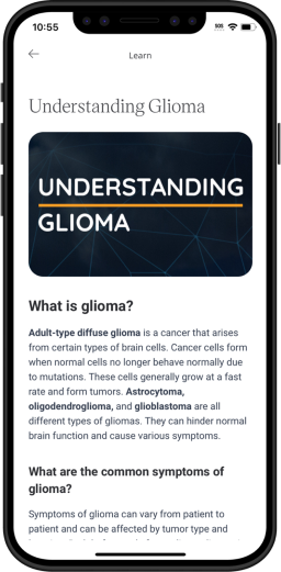 Our Glioma app helps your patient understand their diagnosis. It’s a great resource to learn what glioma is, about diagnosis and management, why mutations matter, and how to work with their healthcare team.
